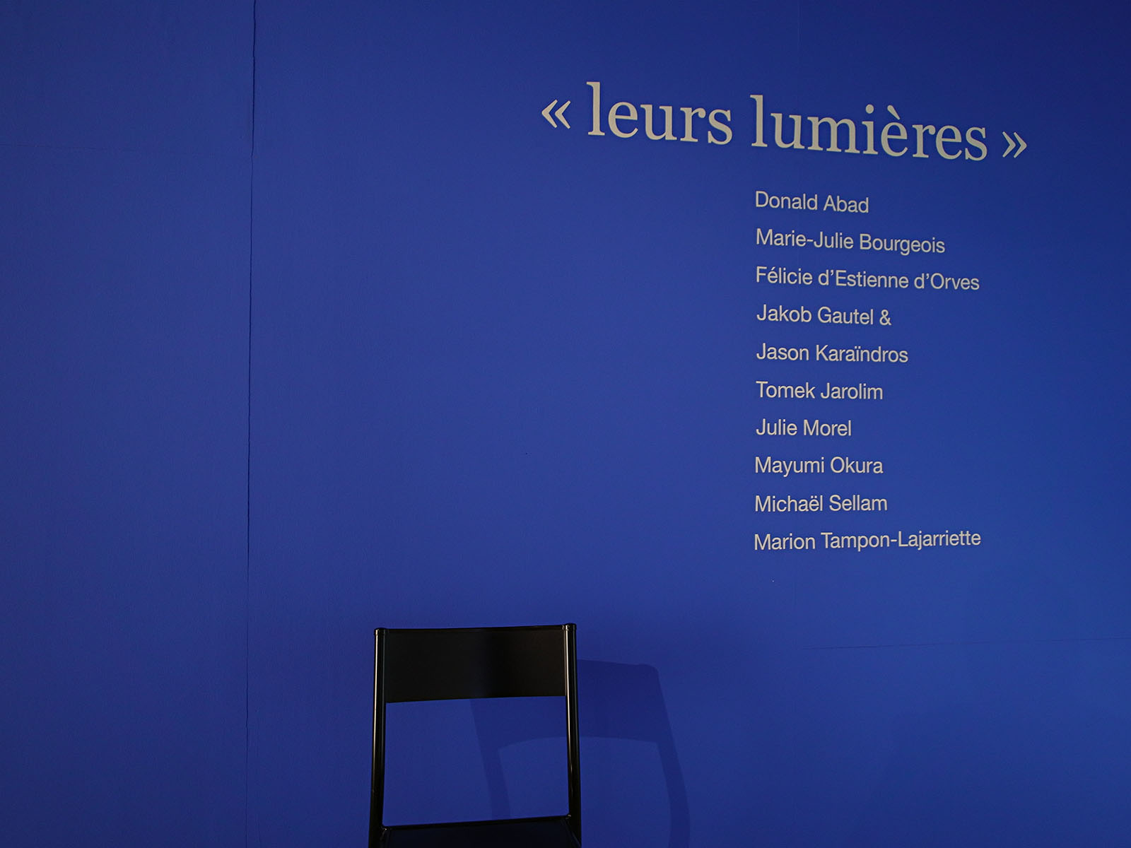 Le découpage de la salle, les cimaises, viennent de l’exposition précédente, Alfred Mannessier. Du tragique à la lumière. Le principe de « leurs lumières » est de se glisser dans cet espace, pour des raisons de temps, d’économie, mais aussi de méthode : on peut toujours trouver à habiter un lieu avec des œuvres contemporaines. Autrement dit, l’exposition a été conçue, pour une part, à partir de ces contraintes, à commencer par le nombre. Dix espaces, donc dix pièces. JLB