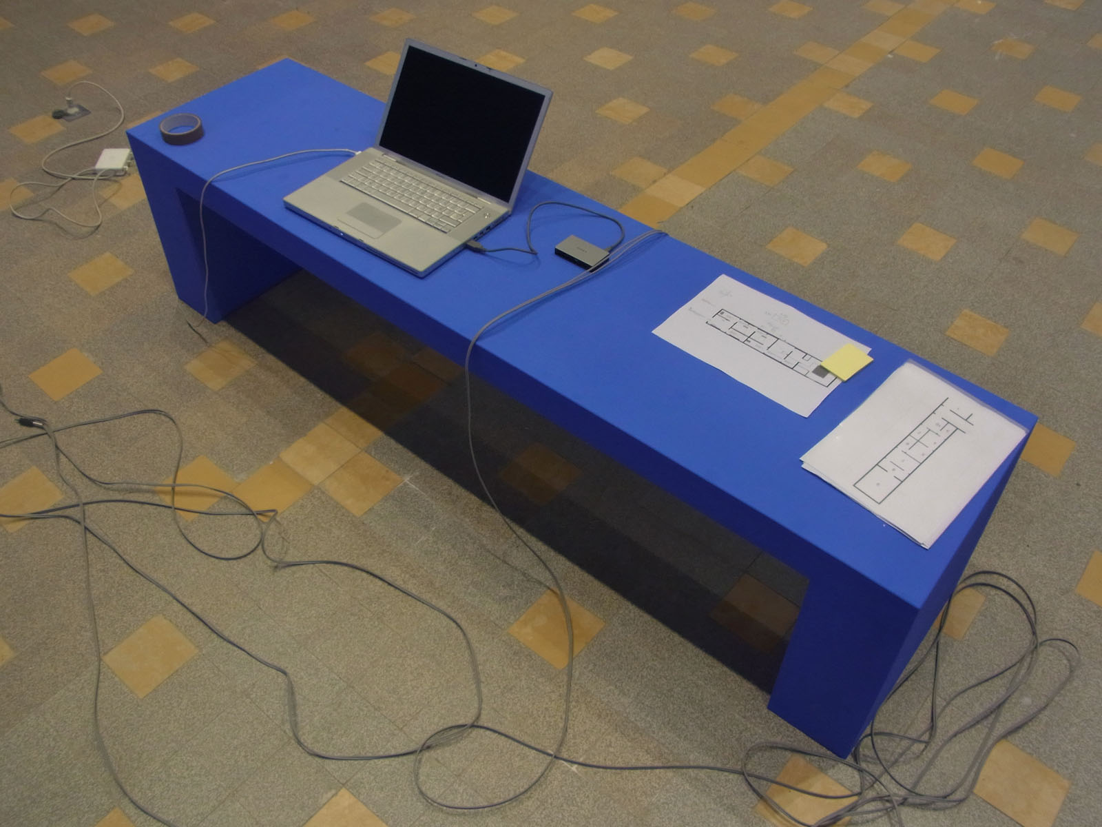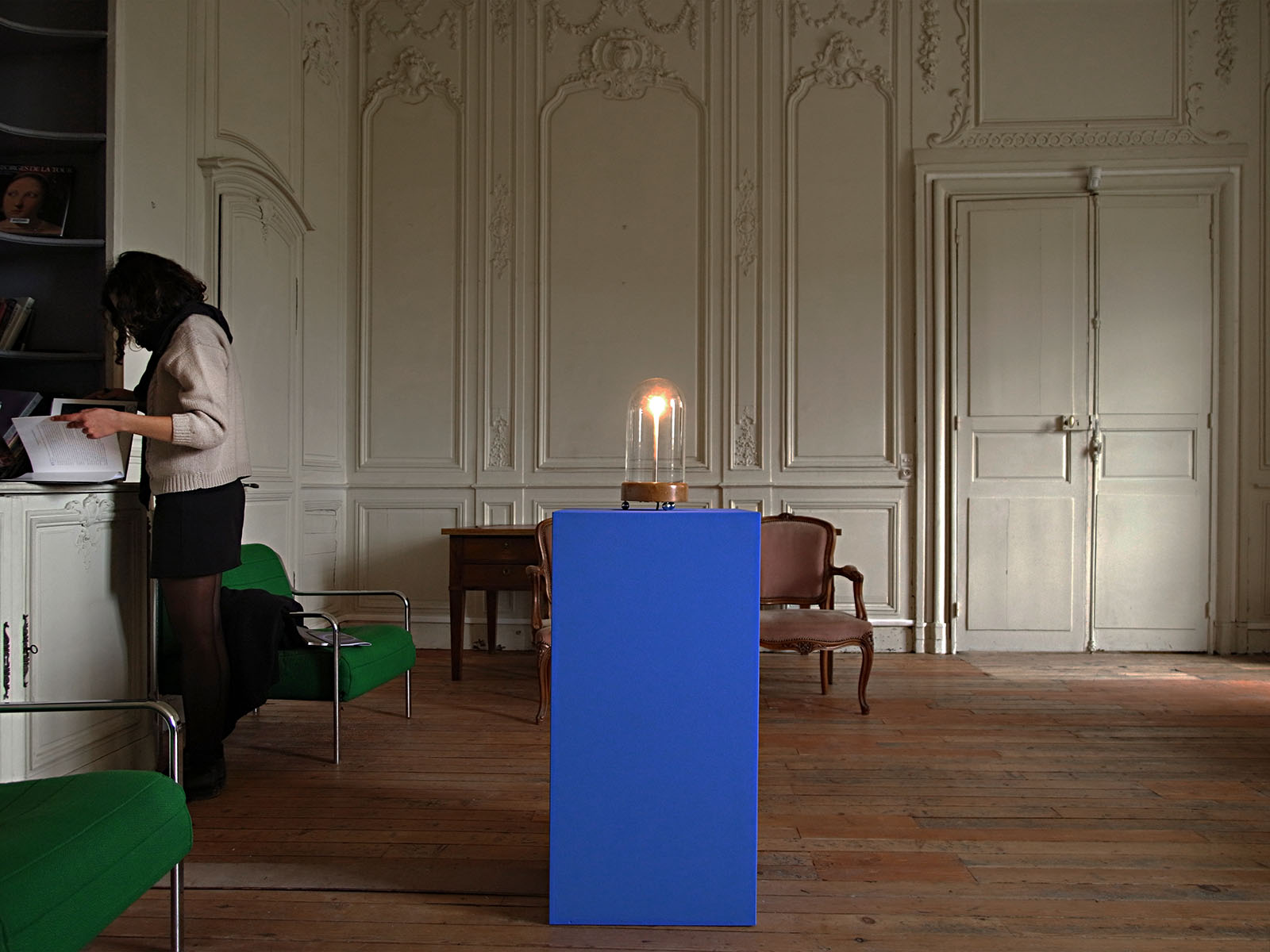 Jeudi 4 octobre 2012, 16h30. Certains éléments de la scénographie pour « leurs lumières » sont peints en bleu vidéo.