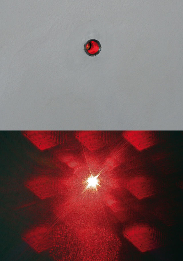 Premise : A sculpture one and a half centimetres wide is discretely embedded within a wall, at eye level. The beam of a red laser is hidden behind a spyhole. Its presence in space is minimal but nevertheless its intervention fills space in a dimension which could be perceived as aggressive yet comical. Faced with this mise en scène, suspecting some danger, since their eye could become a target, observers react with a variety of behaviours, sometimes surprising. The perversity of the object can reveal or accentuate fearful or conniving traits within us.