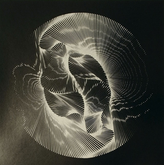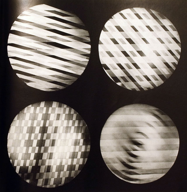 Equipo 57, Composition n°11 (recto verso), 1963, coll. Galerie Denise René. «La lumière est utilisée pour créer un effet de résonance susceptible de mettre en relief le mouvement des espaces — ceci dans le cadre de notre théorie de l’interactivité de l’espace.» A. Duarte. Photo du catalogue KunstLichtKunst