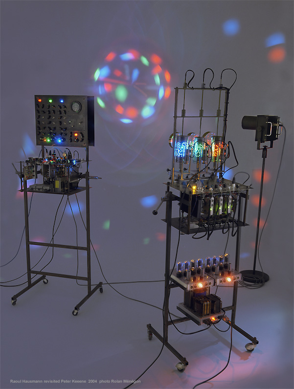 Peter Keene, Raoul Hausmann revisited, installation optophonique, source sonore, synthétiseurs analogiques, appareils de projection, capteurs photomultiplicateurs, haut-parleurs, 2004
