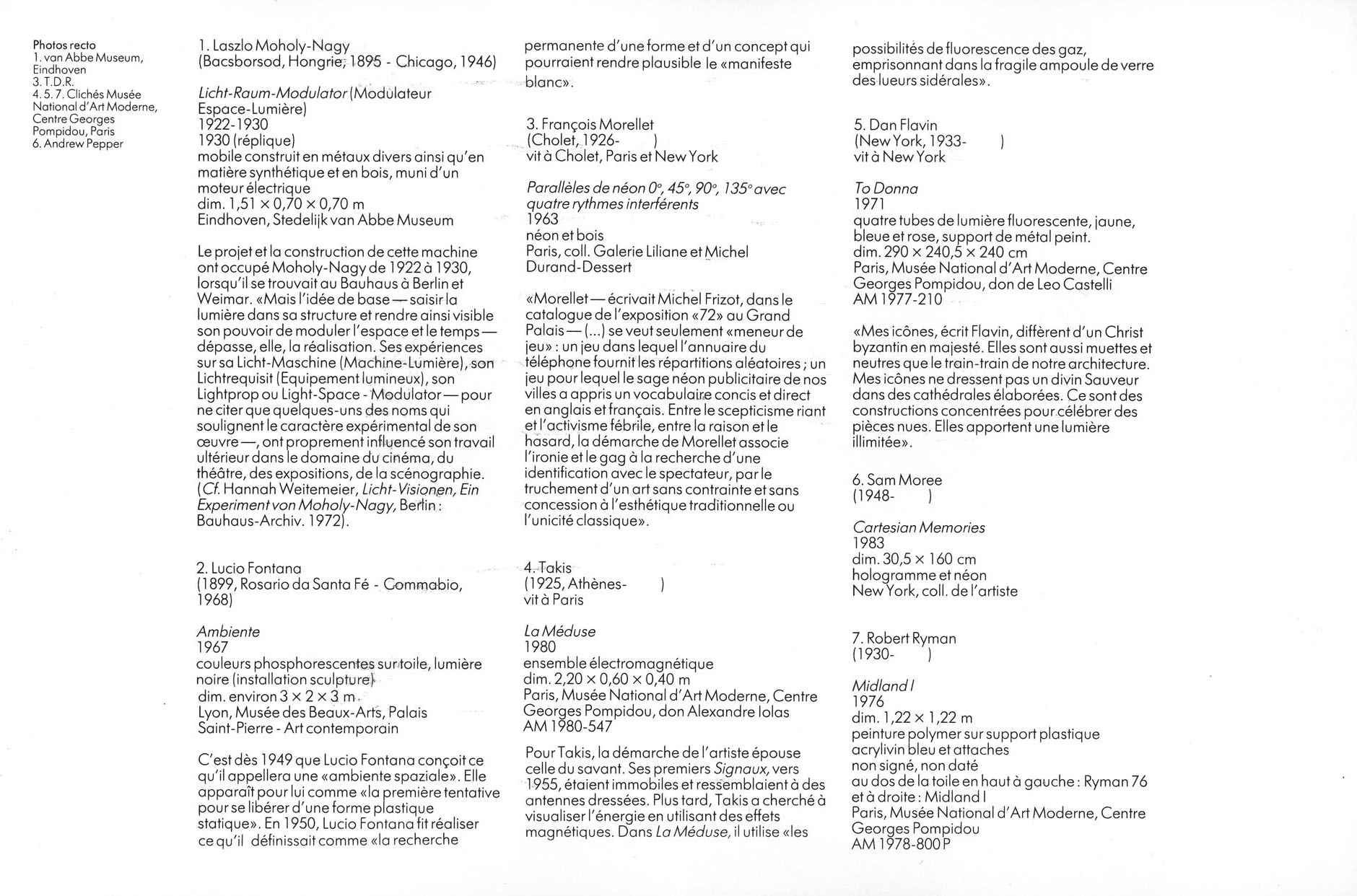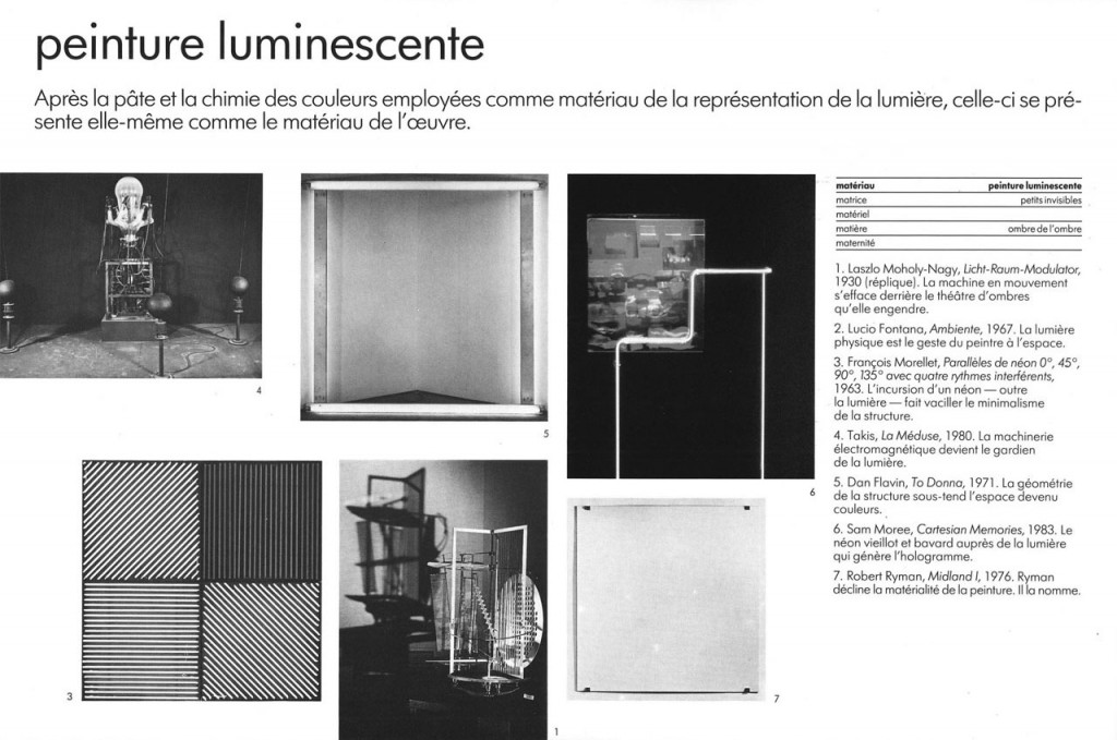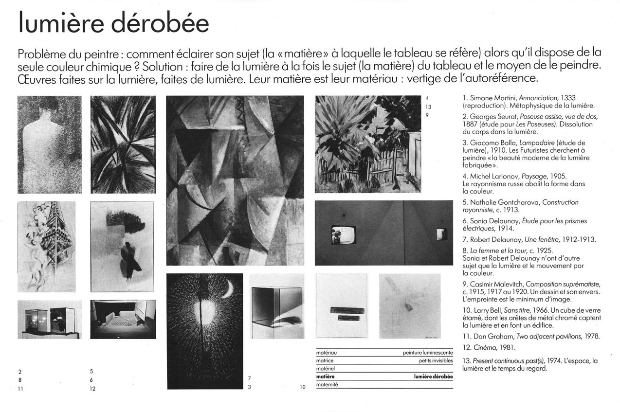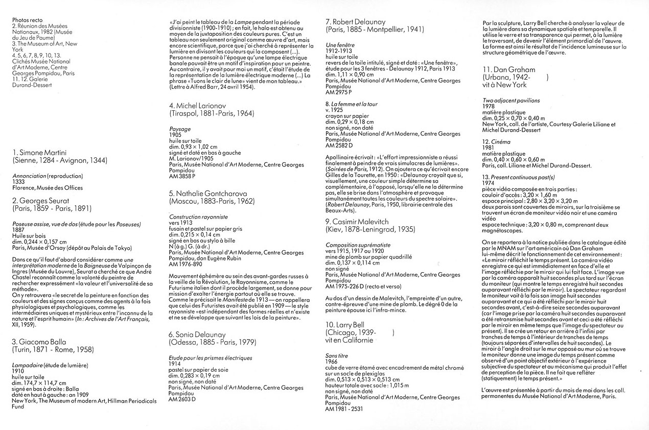 Le catalogue est un ensemble de fiches-œuvres indexées sur chacun de ces thèmes. La lumière, apparaît dans deux sites. Nous reproduisons ici la fiche de la scénographie de l’exposition et les fiches des pièces exposées traitant de la lumière: à vous de les replacer dans leur espace propre.