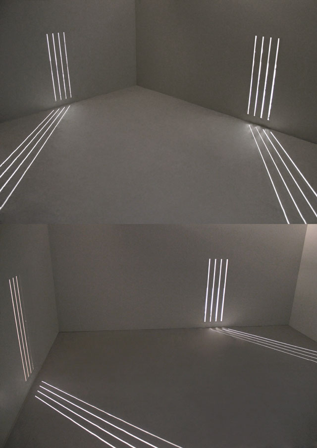 The course of the sun is the inspiration of the interactive environment of Parallèles (Parallels). The rotation of a giant marble enables the spectator to move back and forth through time. The speed and dexterity of the manipulation dictate the visual and auditory ambiance of the installation. The distortion of time is made manifest by the course of the sun as it could be perceived within an enclosed space. Beams of parallel light correspond to the position of the sun at a given instant in time. The rays correspond to the movement of the trackball, they traverse the space of the white room and play upon the bodies of the spectators. The principle is to simulate a disturbance in the equilibrium of our planet by acting upon its speed of rotation. The spectator not only embarks upon a journey in time, but they are also witnesses to the consequences of the virtual disruption of this cycle. Thus, they find themselves in the heart of a special effect inspired by a natural phenomenon which they both actively control and passively experience.
